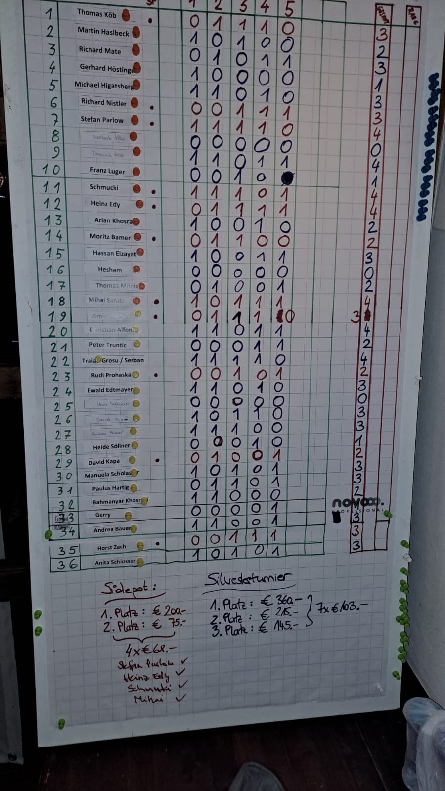 Mit dem Silvesterturnier am 28.12. ist das erste Turnier im neuen Spiellokal der Region Ost mehr als gut gelungen. Insgesamt konnten wir 40 Personen ins "Tunnel Vienna Live" bringen. Davon nahmen 36 aktiv am Turnier teil.